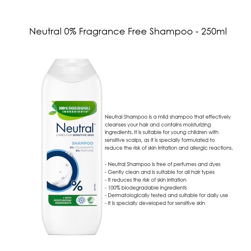 諾淨 Neutral Perfume Free Shampoo 讓您的頭髮柔軟順滑,不會刺激頭皮 pH 中性,溫和清潔頭髮中的髒污雜質,適合每天使用 - 每天使用洗髮水輕輕清潔頭髮 - 0% 香水 - 0% 染料 - 經過皮膚病學測試並獲得批准 - 適合所有髮質 - pH 值呈中性 250ml