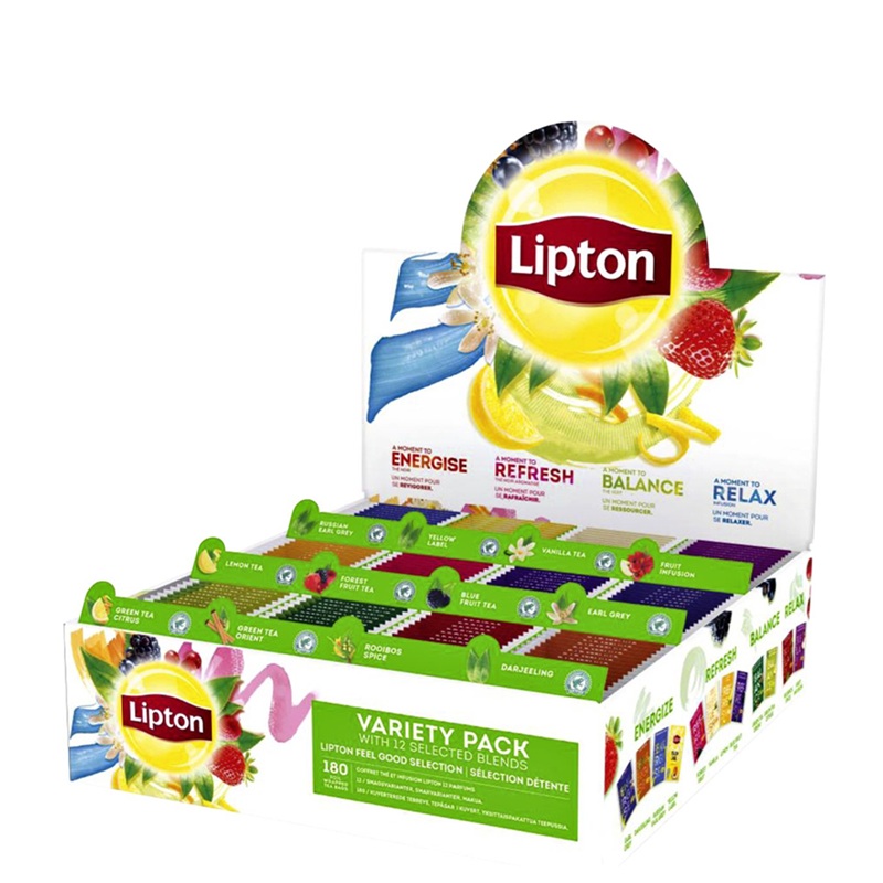 立頓好心情精選茶 什錦茶盒包含12種不同口味,180個獨立茶包,內含紅茶、綠茶、水果茶和花草茶,適合一天中的每一刻。 這款茶採用永續種植,產自雨林聯盟認證的茶園。 茶包獨立包裝於紙質信封。 這些信封為茶葉提供最佳保護,保留其香氣和風味。 快速方便地設置展示架。 紙質包裝使用後可放入紙箱回收。
